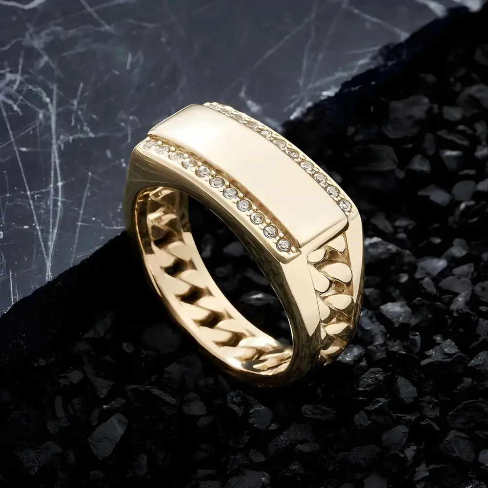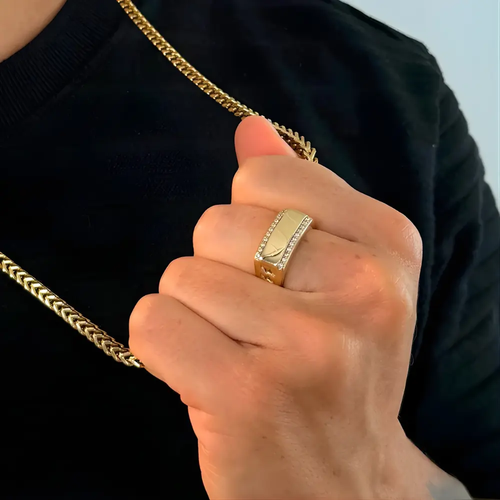 El anillo oro laminado para hombre Apolo combina elegancia y masculinidad en una sola pieza. Fabricado en oro laminado 18k, su diseño robusto presenta un acabado pulido con líneas de circones engastados a los lados, que añaden brillo y distinción sin perder su estilo varonil.