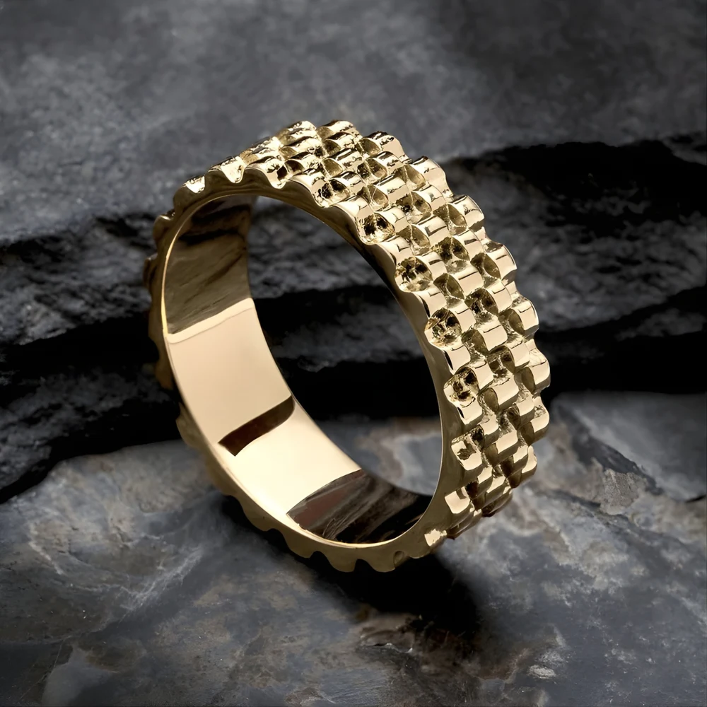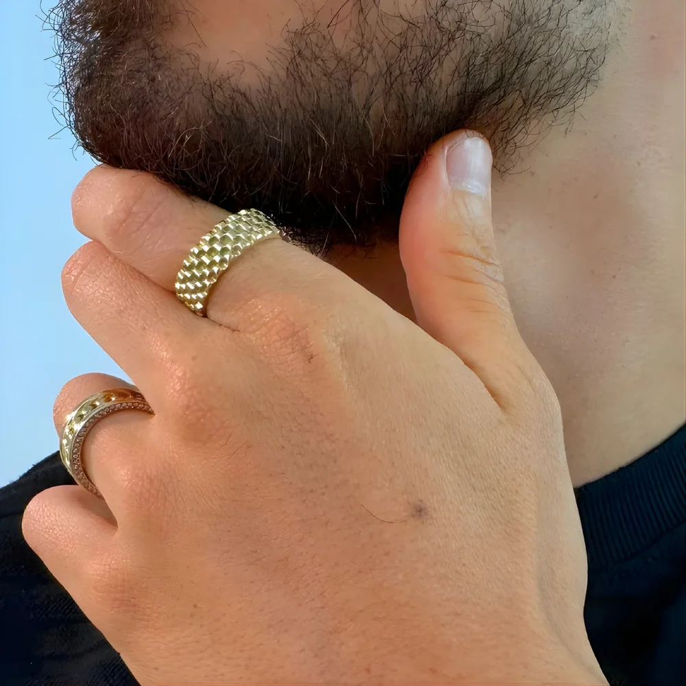 Anillo masculino estilo Titan elaborado en oro laminado 18k con superficie texturizada tipo malla. Su diseño moderno y robusto refleja elegancia y carácter, ideal para quienes buscan una joya distintiva y resistente.