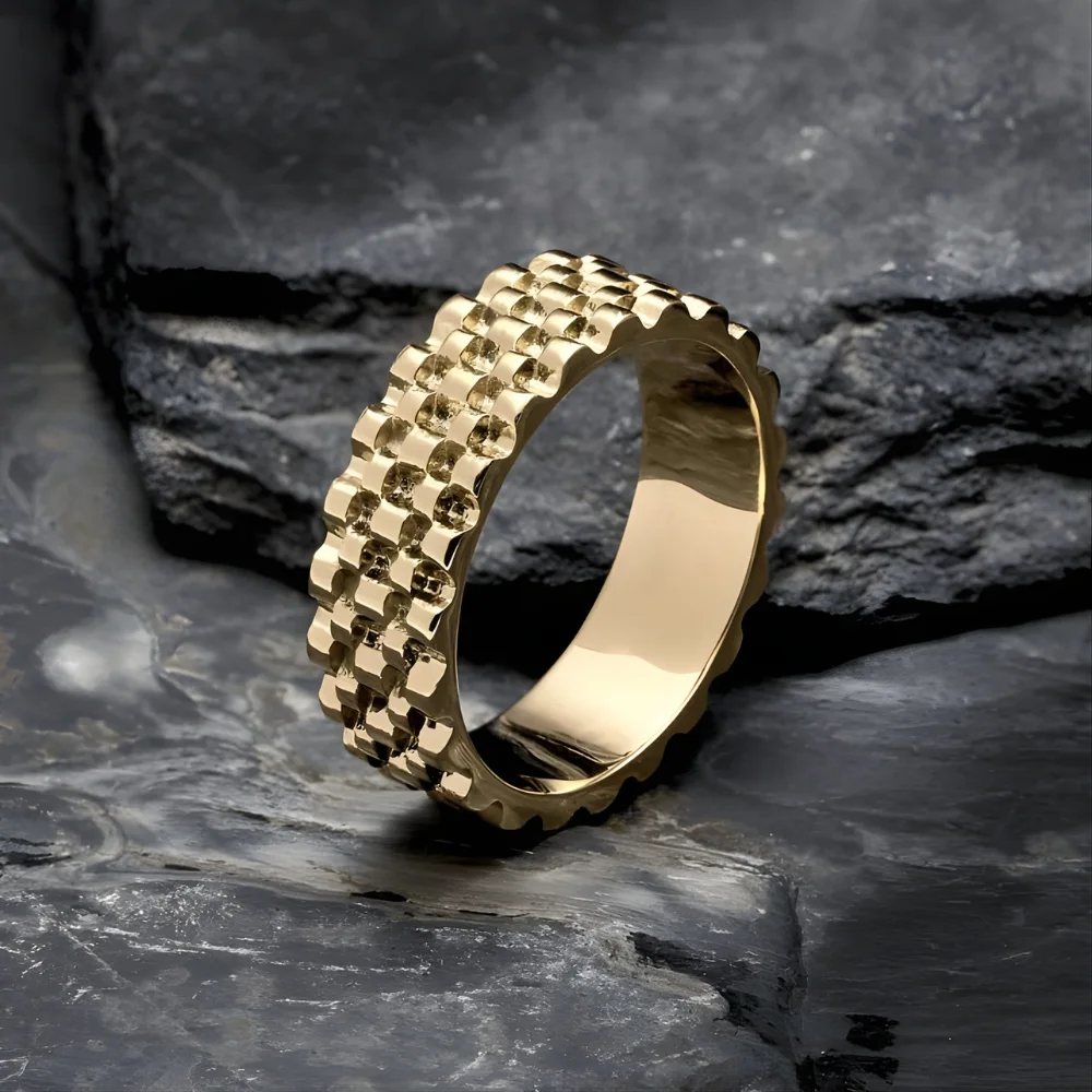 Anillo Titan para hombre en oro laminado 18k. Diseño texturizado tipo malla, elegante, resistente y duradero. Envíos a toda Colombia.