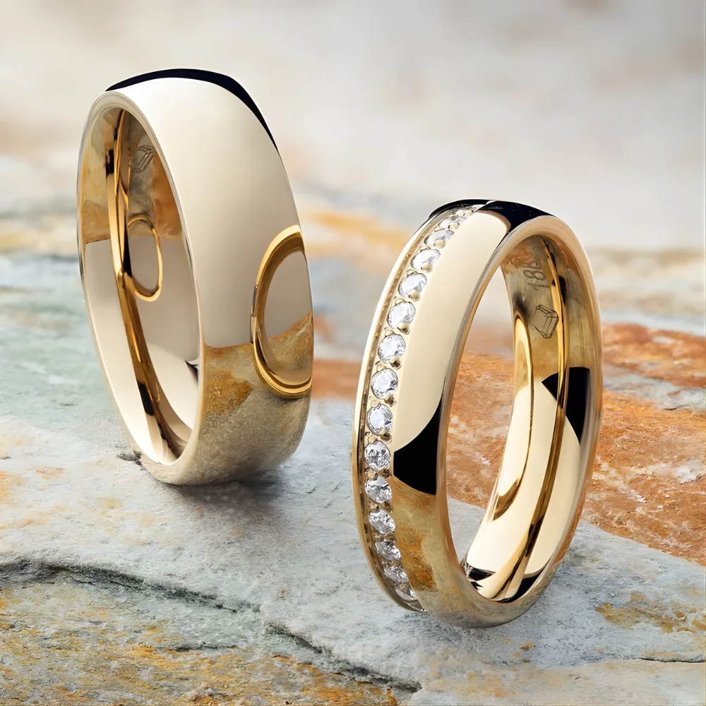 Par de argollas de matrimonio elaboradas en oro laminado 18k con diseño elegante y contemporáneo estilo Greta. Una de las piezas presenta incrustaciones de circones brillantes, mientras la otra conserva un acabado completamente liso y pulido. Su equilibrio entre sobriedad y brillo simboliza la unión perfecta.