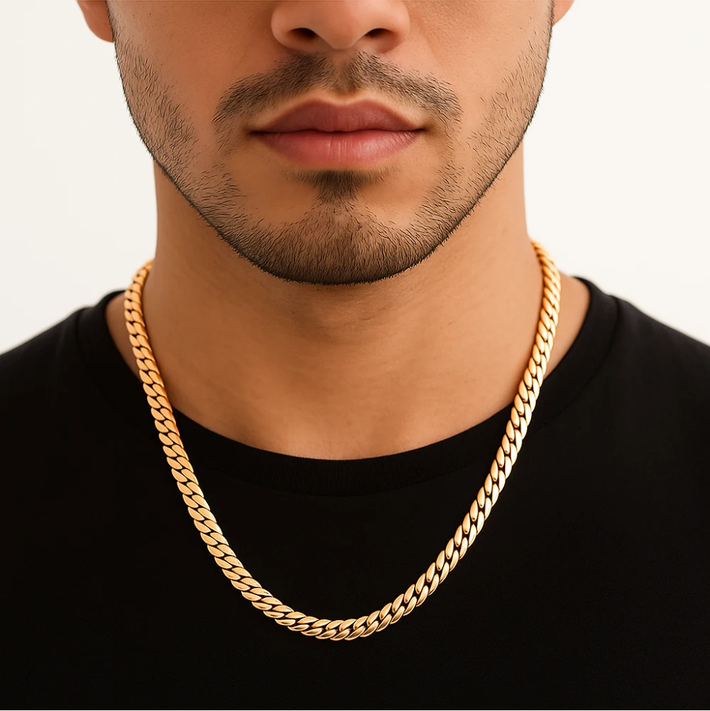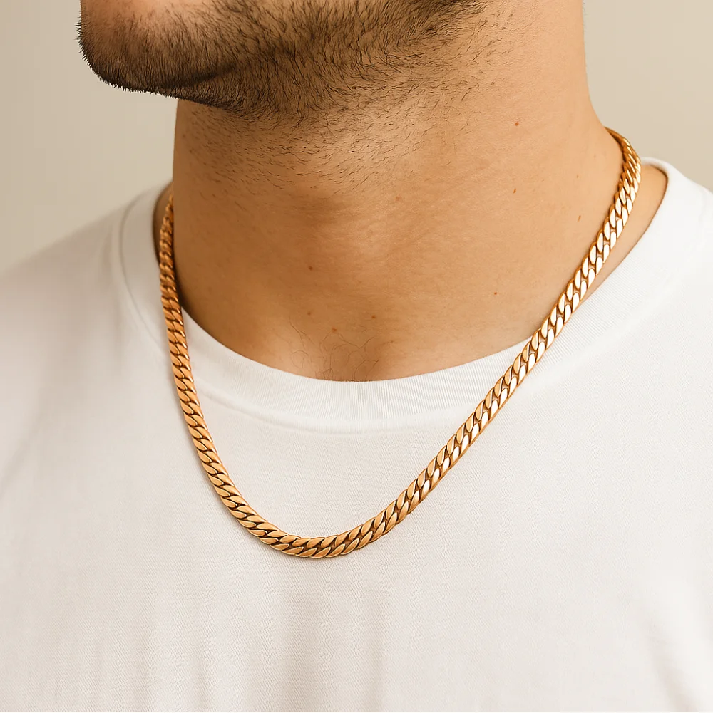 La cadena de oro laminado rosa tejido serpiente para hombre combina elegancia y modernidad en una pieza de acabado impecable. Fabricada con base de titanio y recubierta con oro laminado 18K, ofrece alta resistencia y un brillo cálido que resalta cualquier look masculino.