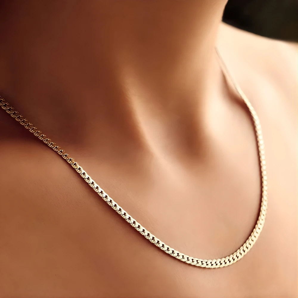 Con un ancho de 3 mm y un largo de 45 cm, esta cadena se adapta cómodamente al cuello, aportando un toque elegante a cualquier atuendo.