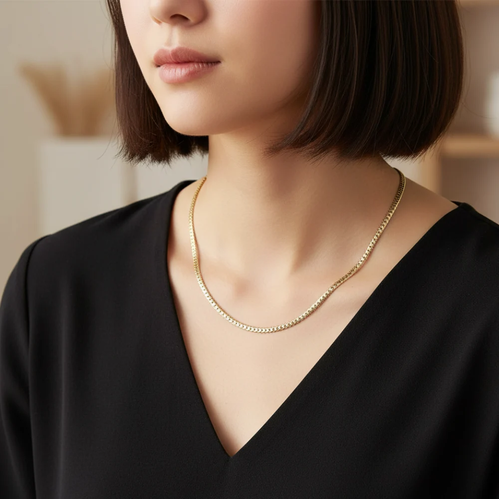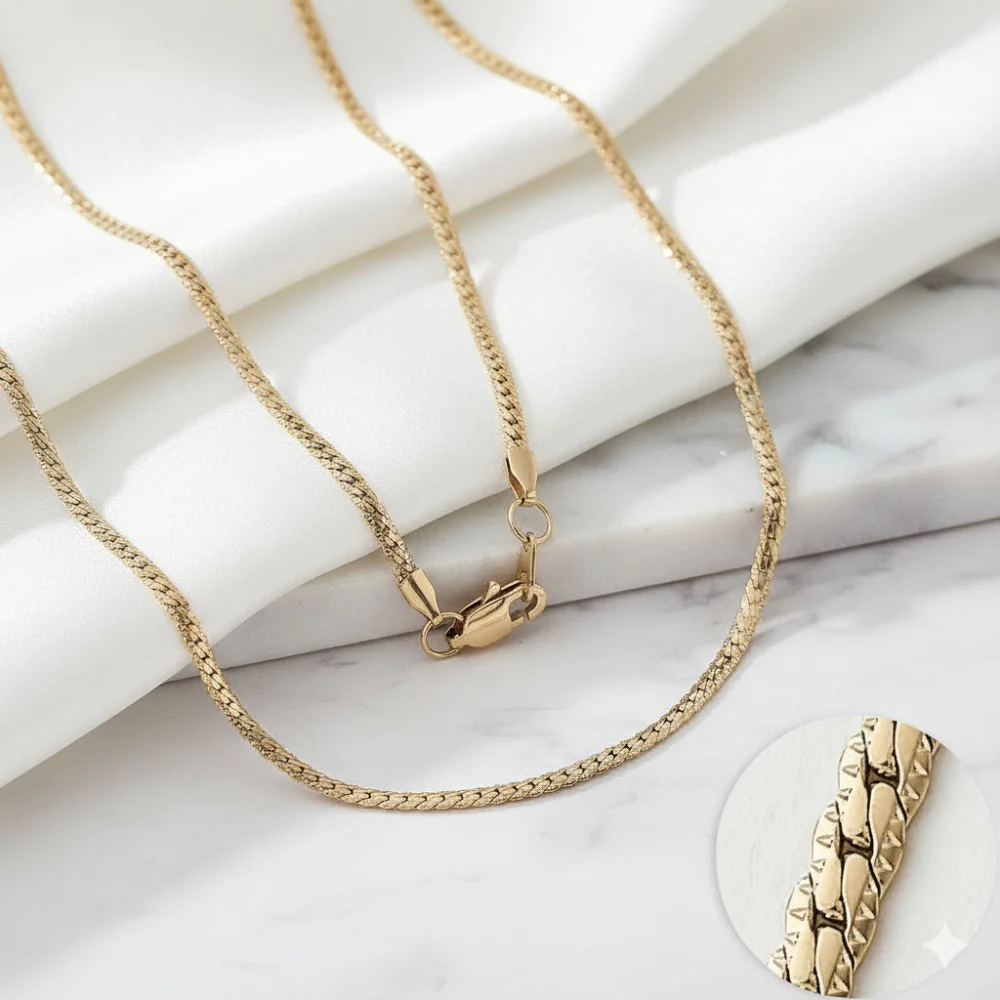 La cadena de oro laminado tejido cubano para mujer es una pieza clásica que combina fuerza, elegancia y versatilidad. Fabricada con base de titanio y recubierta con una capa de oro laminado 18K, ofrece una apariencia de lujo con gran resistencia al desgaste y brillo duradero.