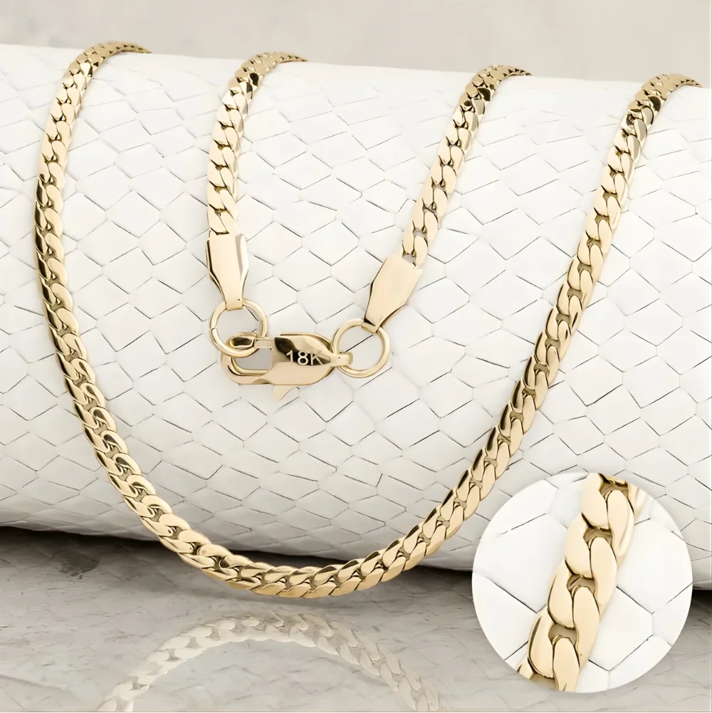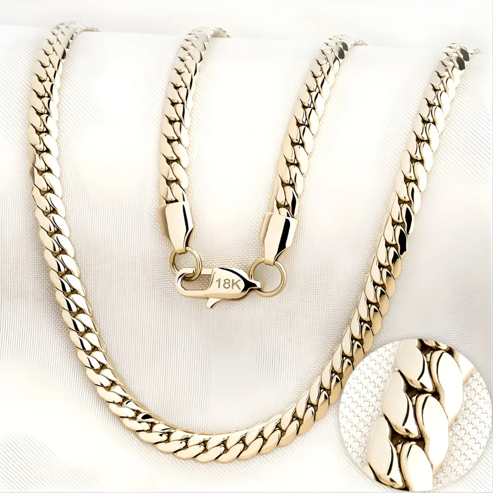 La cadena de oro laminado tejido serpiente para hombre destaca por su flexibilidad y brillo uniforme, logrando un equilibrio perfecto entre estilo y sofisticación. Fabricada con base de titanio y una capa de oro de 18K, combina durabilidad y apariencia premium, manteniendo su color y lustre con el paso del tiempo.