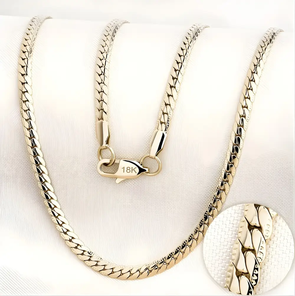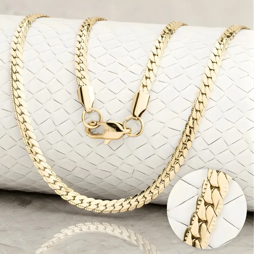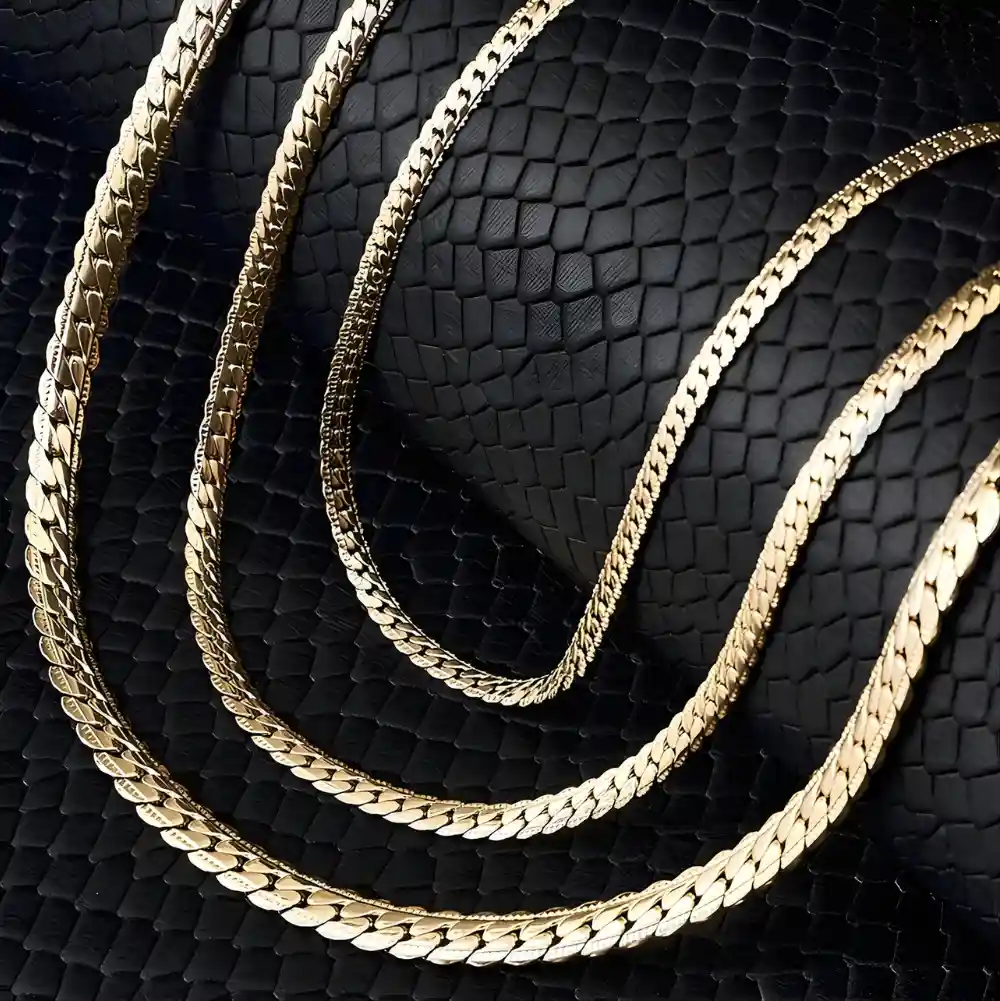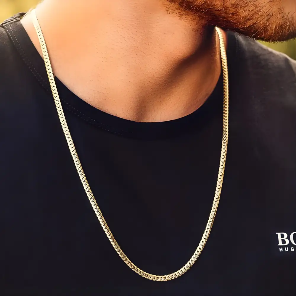 La cadena grabada en oro laminado para hombre destaca por su acabado pulido y textura detallada que refleja elegancia y carácter. Su diseño con grabado fino ofrece un brillo superior, ideal para quienes buscan una joya masculina con presencia y durabilidad.