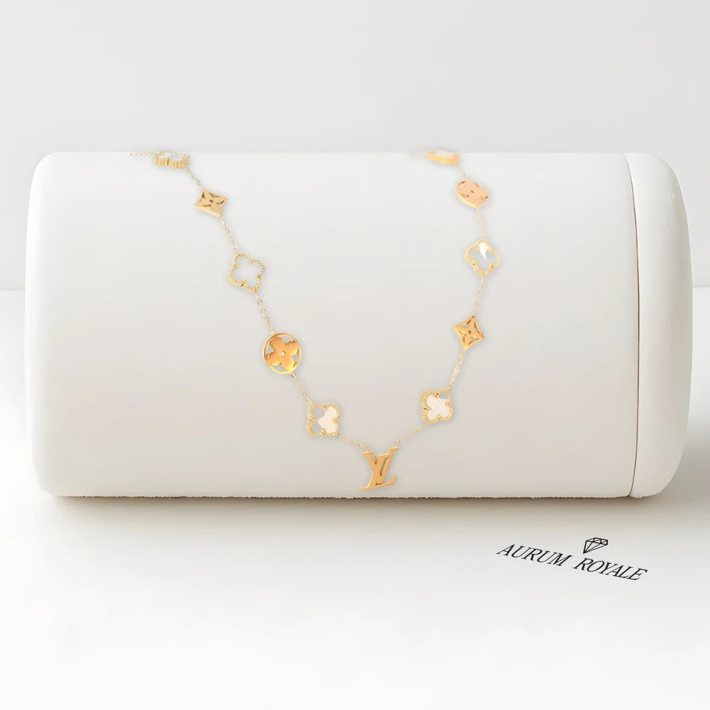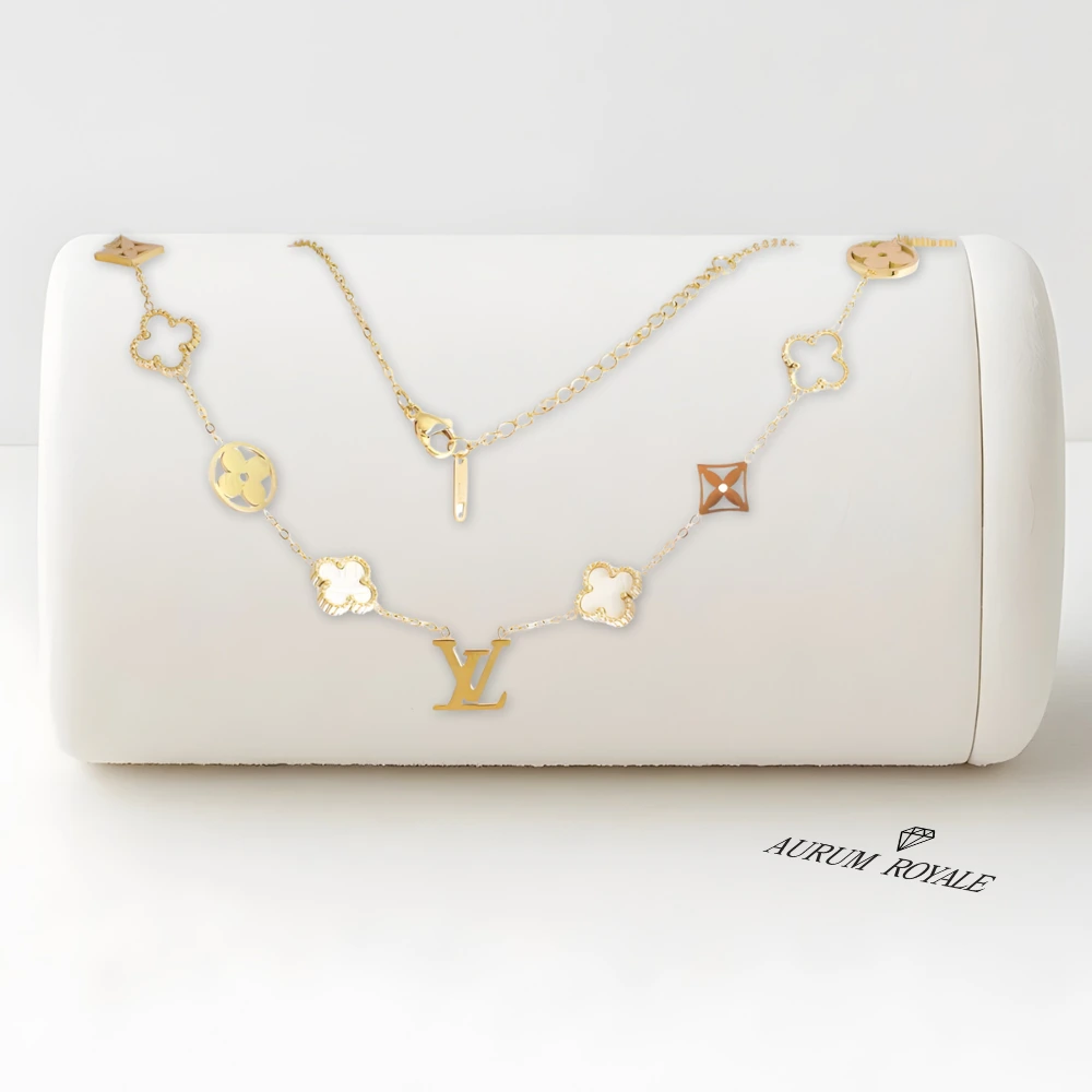 Destaca con elegancia y estilo con esta cadena LV blanca para mujer en oro laminado 18k, inspirada en los icónicos diseños de alta moda. Su combinación de detalles blancos esmaltados y símbolos decorativos dorados crean un contraste sofisticado que realza cualquier outfit.