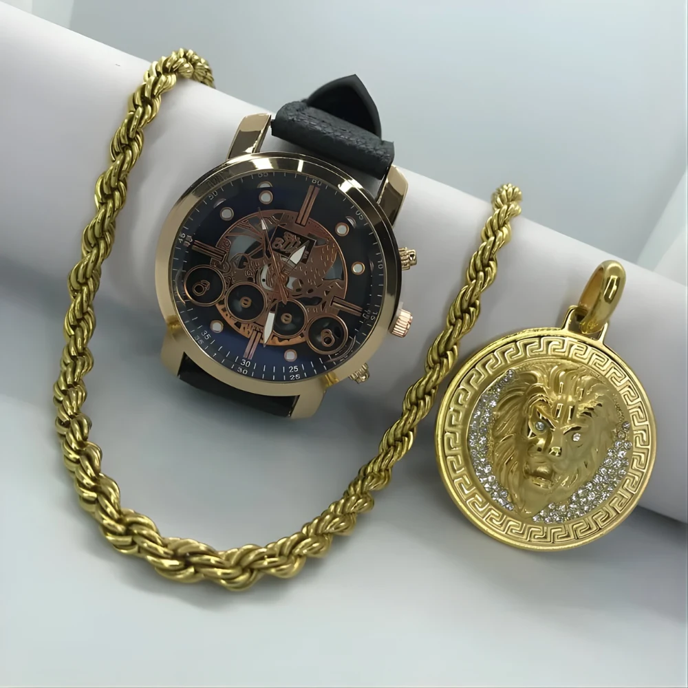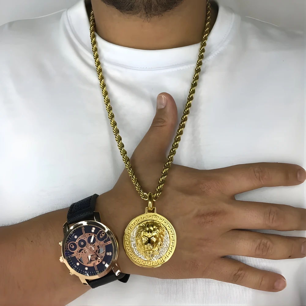 Combo estilo lazo con cadena, pulsera y dije de león en oro laminado 18k. Incluye reloj de lujo y manillas de protección. Unidades limitadas con envío a toda Colombia.