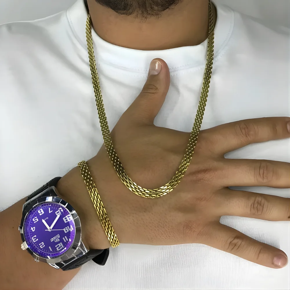 Refina tu estilo con este combo exclusivo de edición limitada, inspirado en el clásico tejido chino, reconocido por su diseño entrelazado y elegante. Cada pieza combina resistencia, brillo y un acabado impecable que resalta en cualquier ocasión.