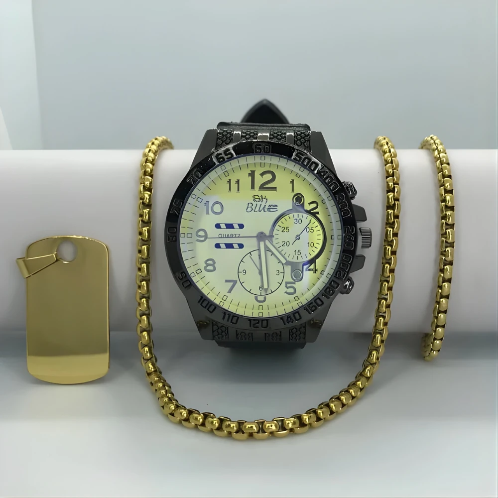 Combo estilo veneciano en oro laminado 18k, cadena, dije y pulsera + reloj deportivo de lujo