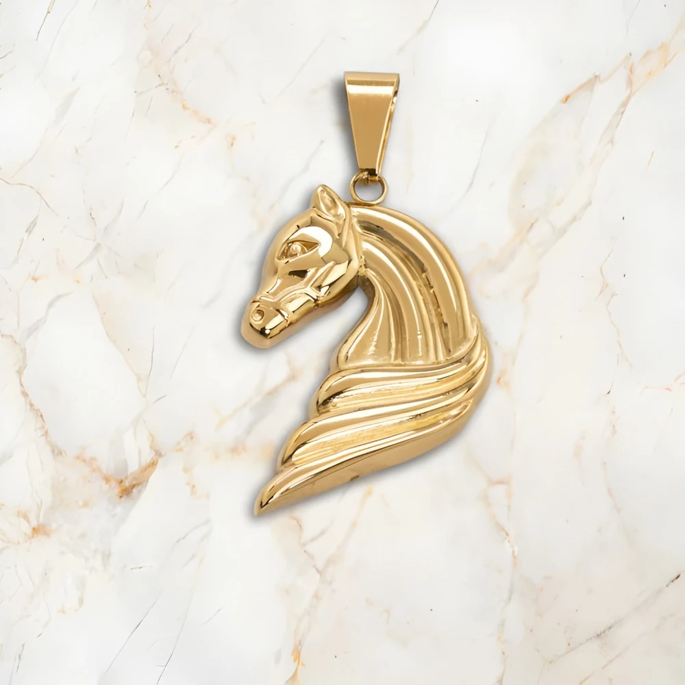 Dije con forma de cabeza de caballo elaborado en oro laminado 18k. Su diseño detallado y acabado pulido reflejan fuerza, elegancia y estilo, ideal para quienes admiran este símbolo de poder y libertad. Perfecto para usar con cadenas medianas o gruesas.