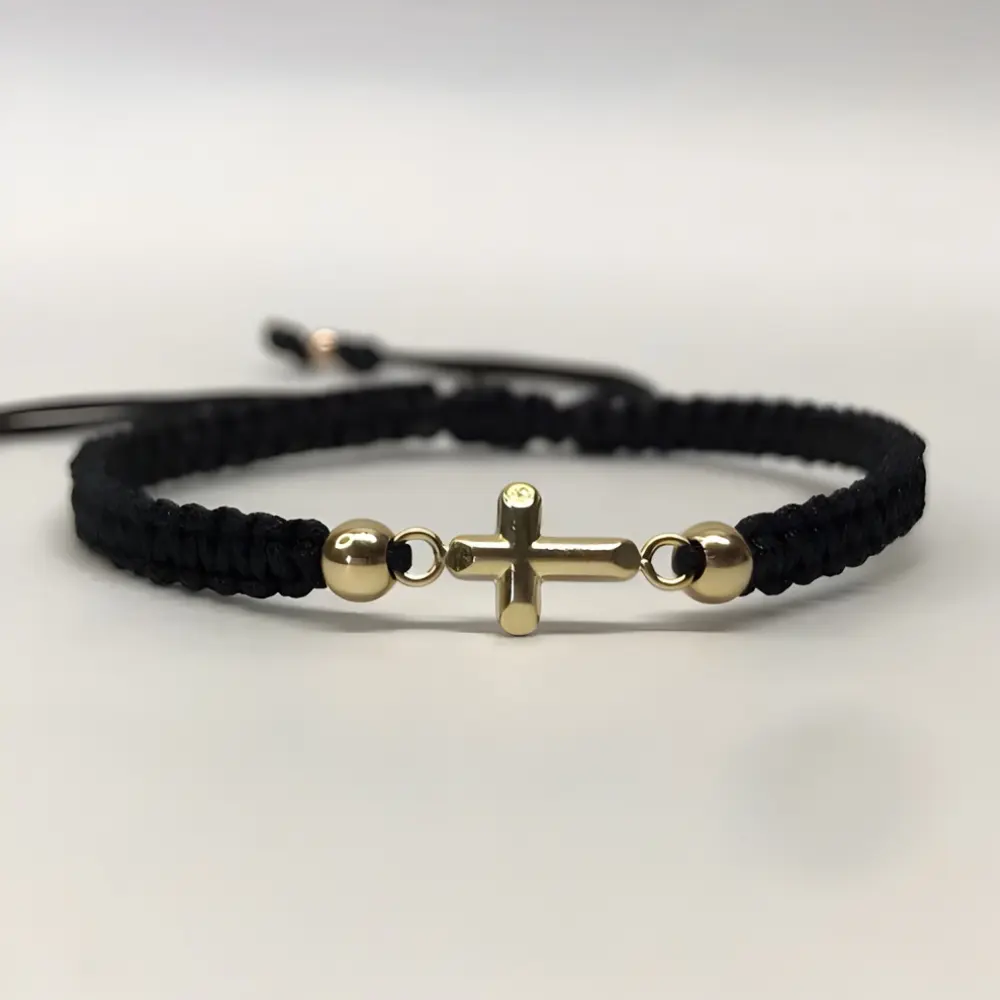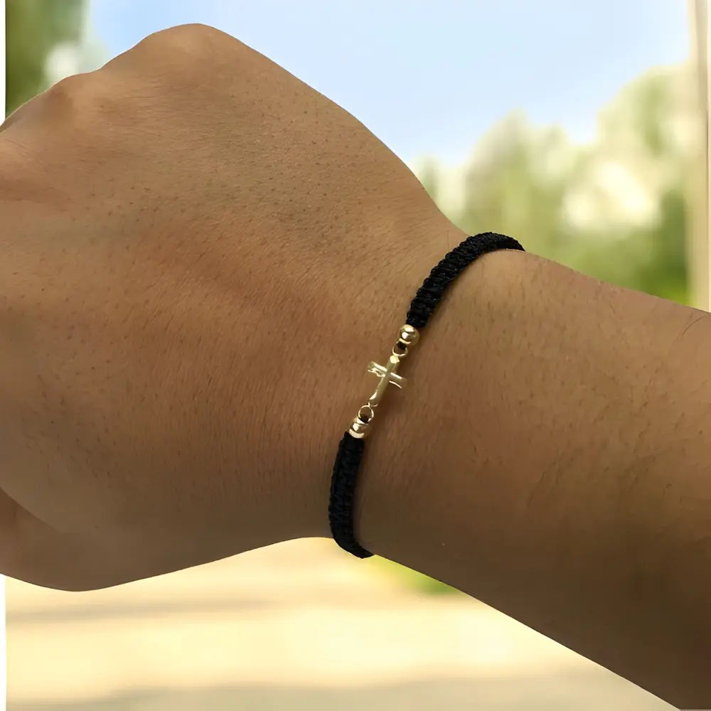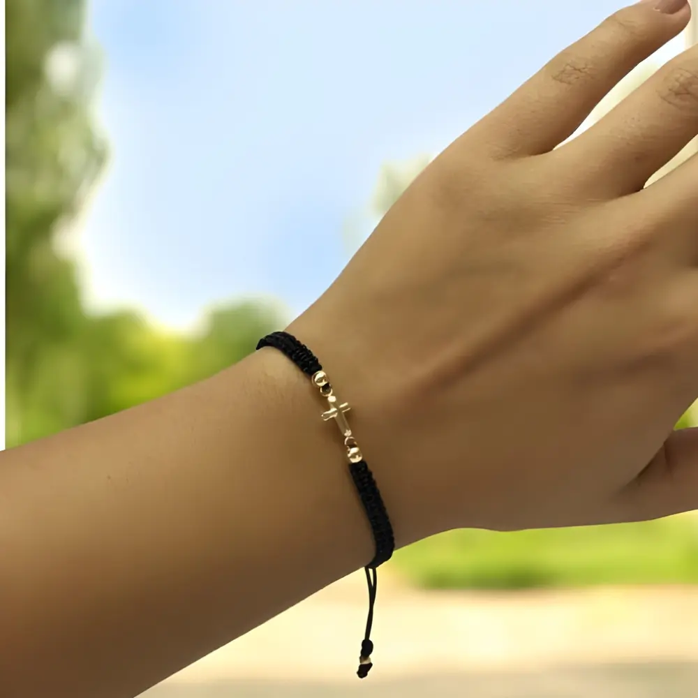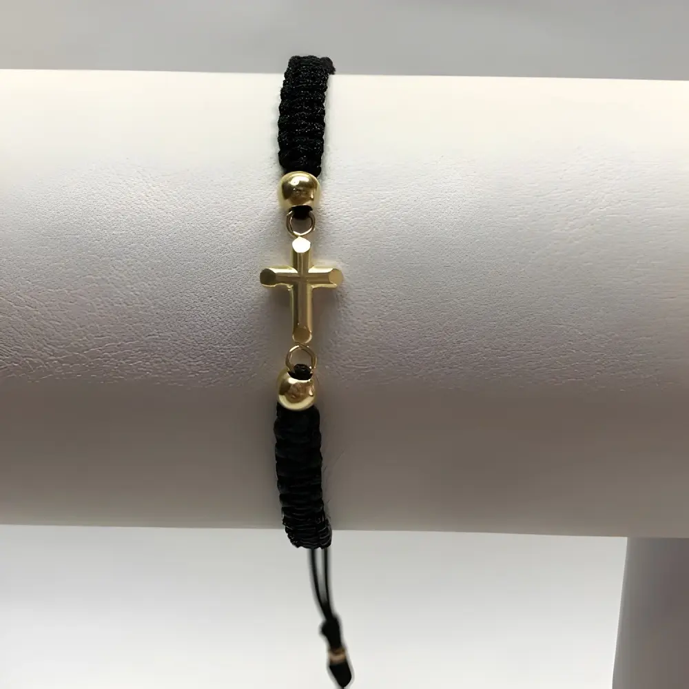 La manilla tejida cruz oro laminado para hombre o mujer combina elegancia y significado espiritual en un diseño moderno y resistente. Su tejido ajustable en hilo negro aporta comodidad y estilo, mientras la cruz central y los balines en oro laminado 18k reflejan un brillo sutil y duradero.