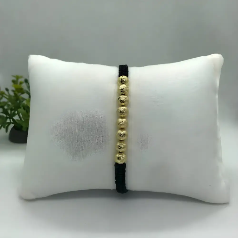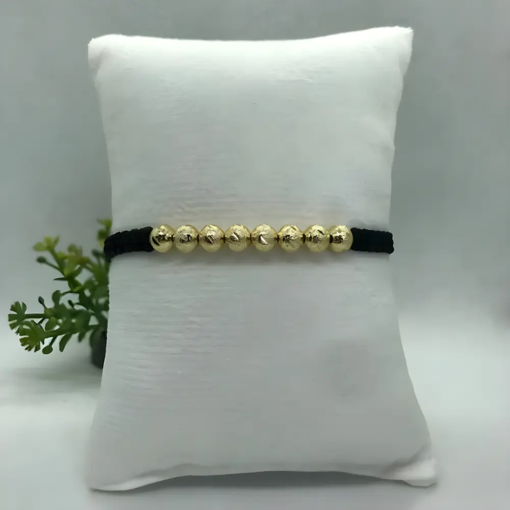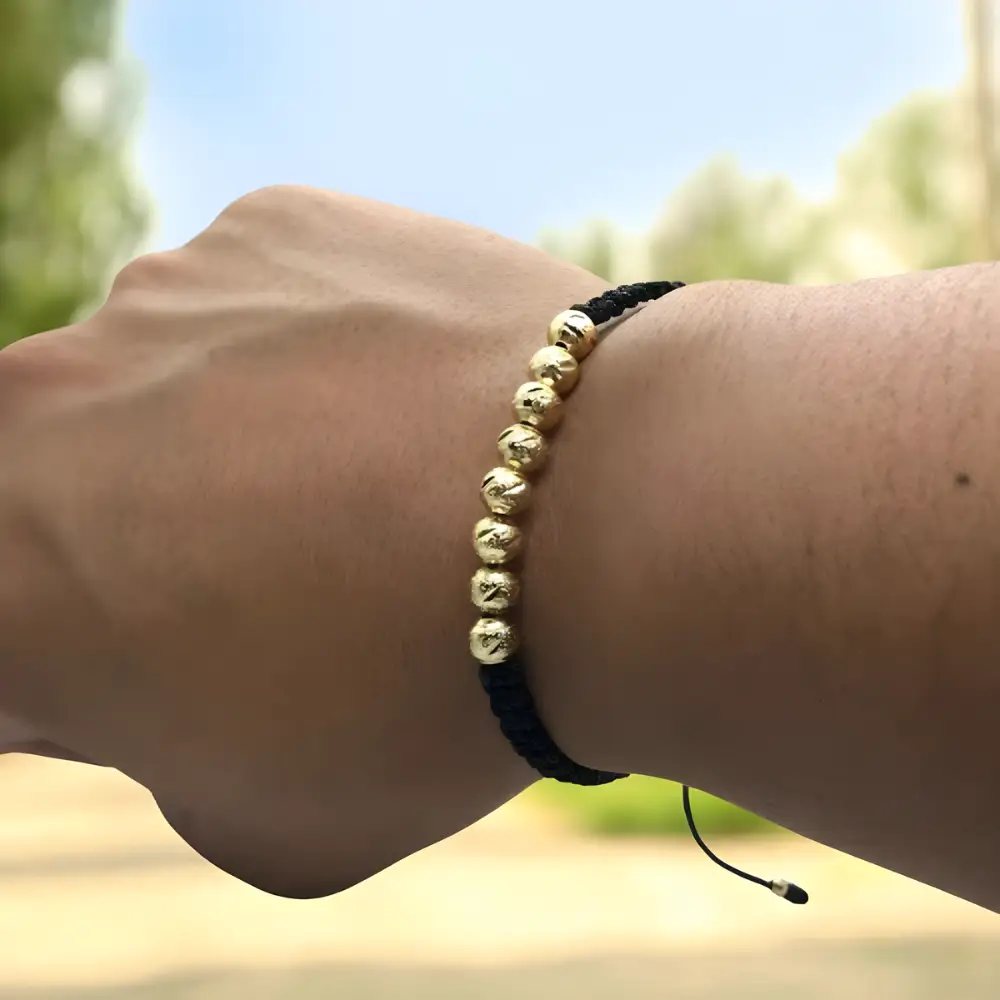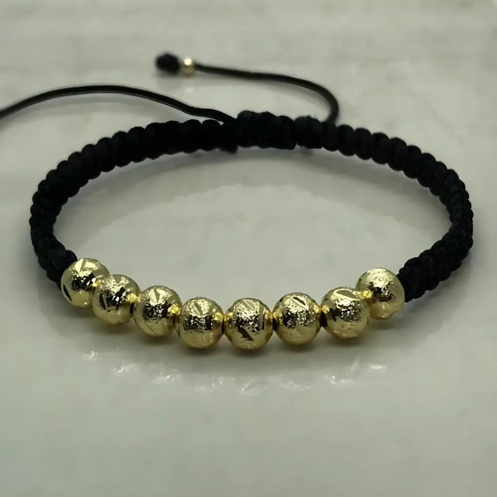 La manilla tejida Italy con balines en oro laminado combina elegancia y significado espiritual en una pieza moderna y resistente. Su diseño artesanal incorpora balines lisos de en oro laminado 18k, creando un contraste perfecto con el tejido negro ajustable.