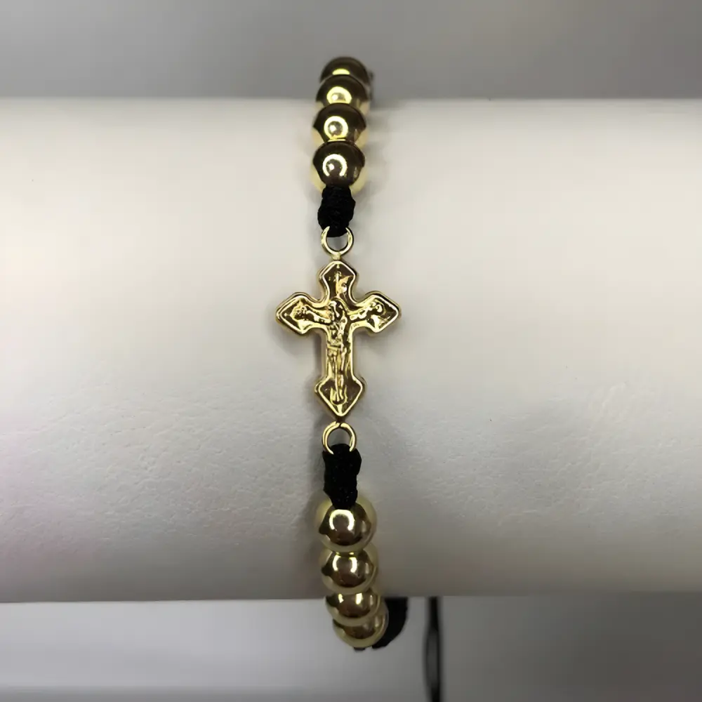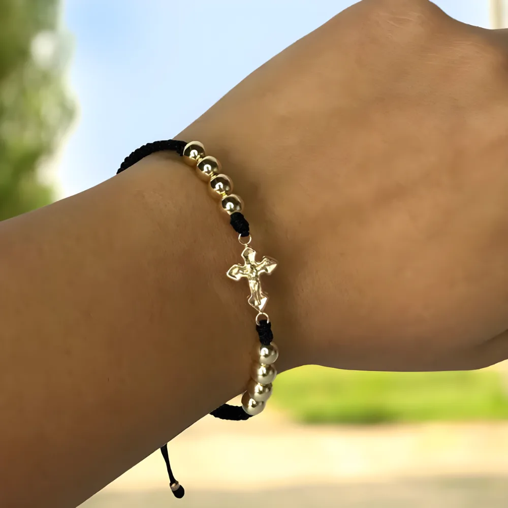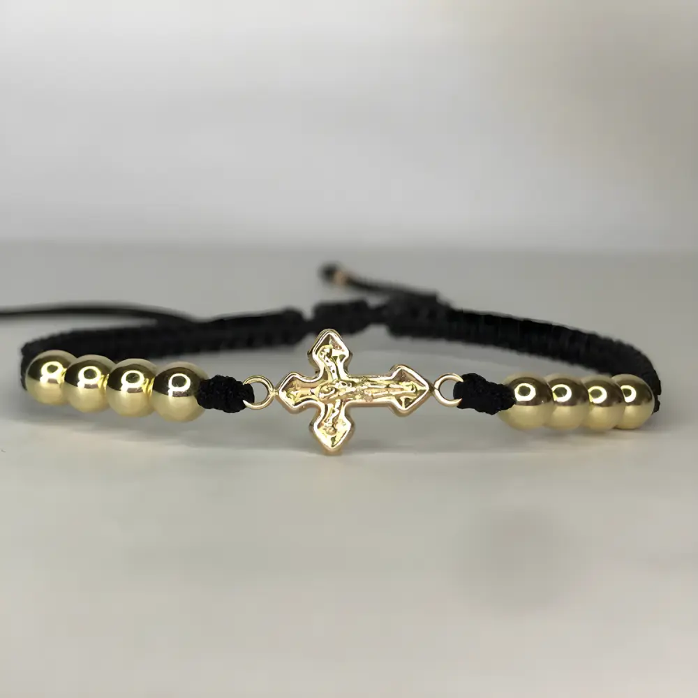 La manilla tejida cruz punta diamante oro laminado combina elegancia y significado espiritual en una pieza moderna y resistente. Su diseño artesanal incorpora una cruz con punta de diamante y balines lisos de en oro laminado 18k, creando un contraste perfecto con el tejido negro ajustable.