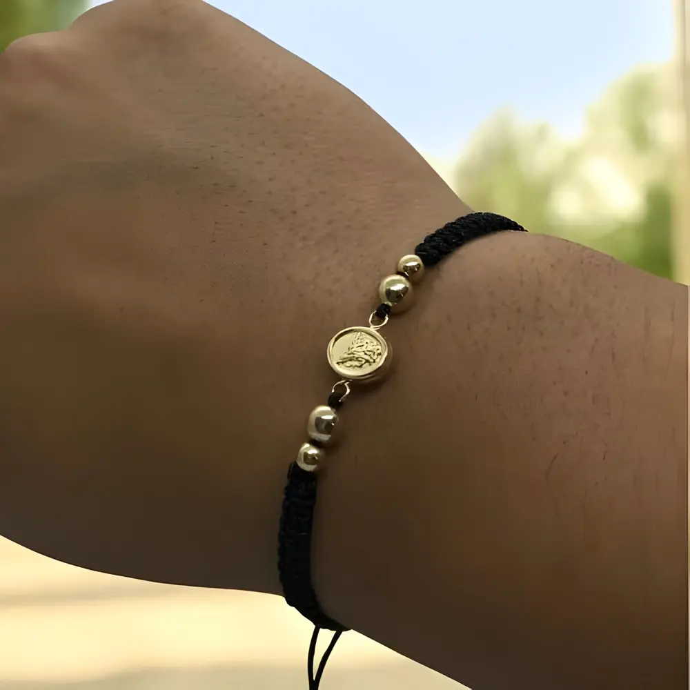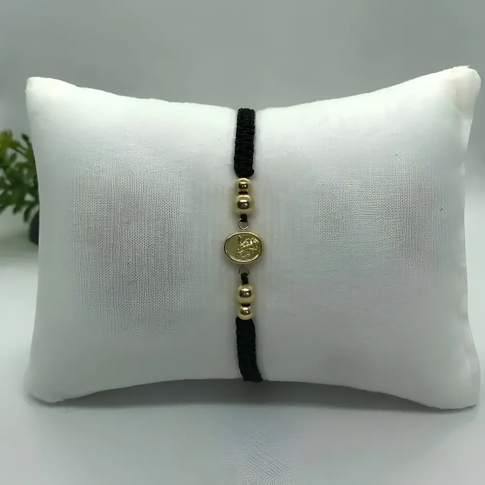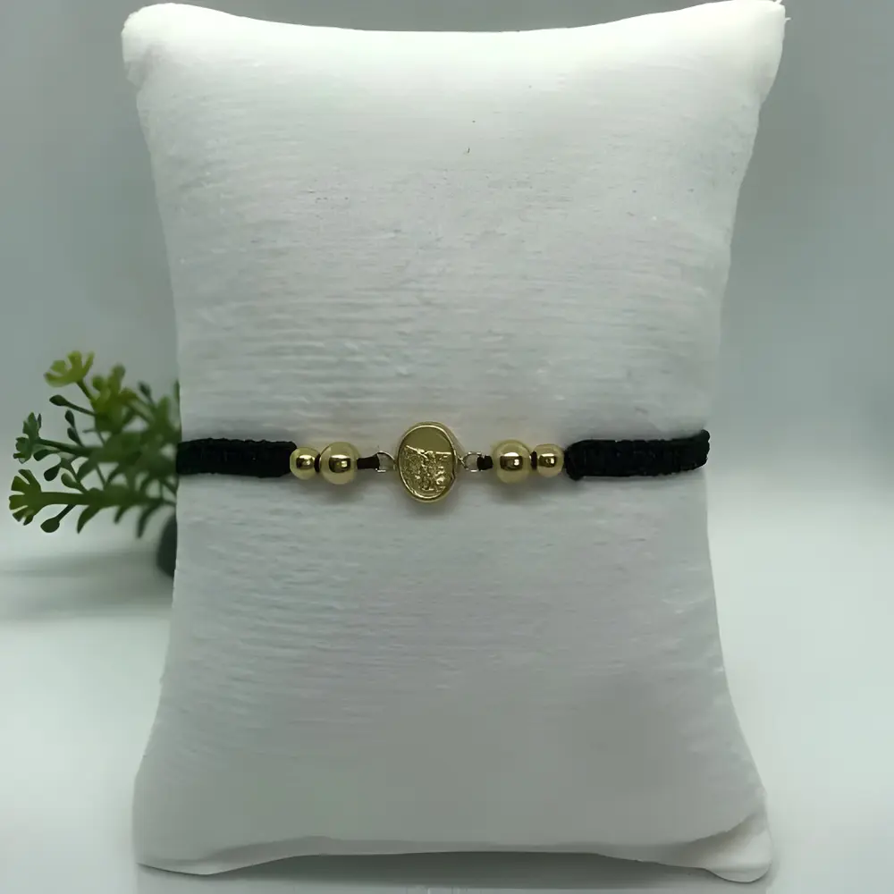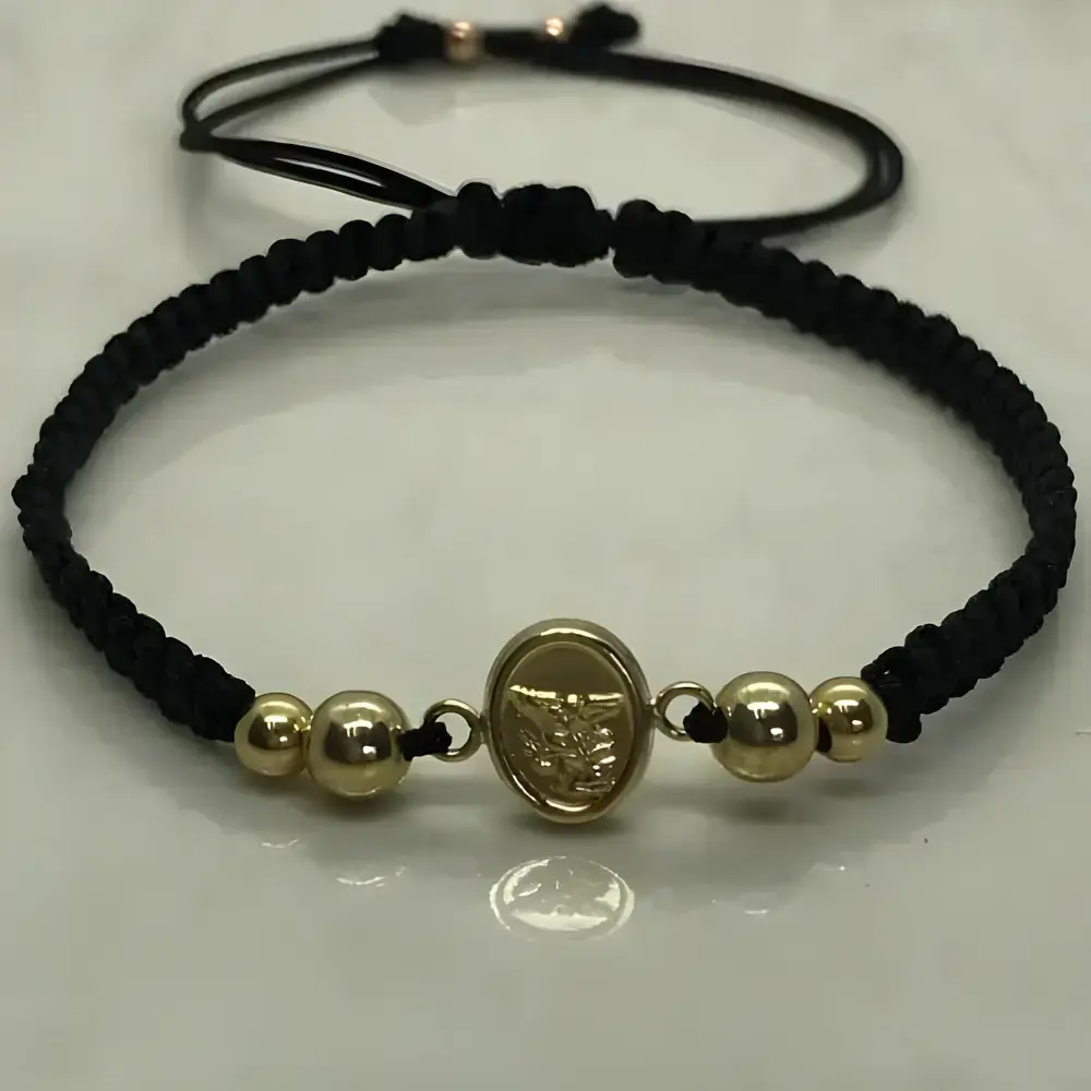 La Manilla tejida dije de san miguel arcángel simboliza protección, fuerza y fe. Elaborada con hilo negro trenzado de alta resistencia y balines lisos en oro laminado 18k, combina elegancia espiritual con un estilo moderno y masculino.