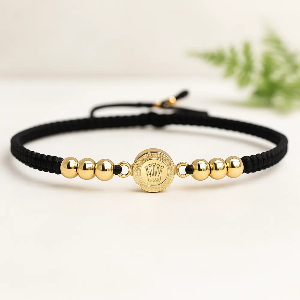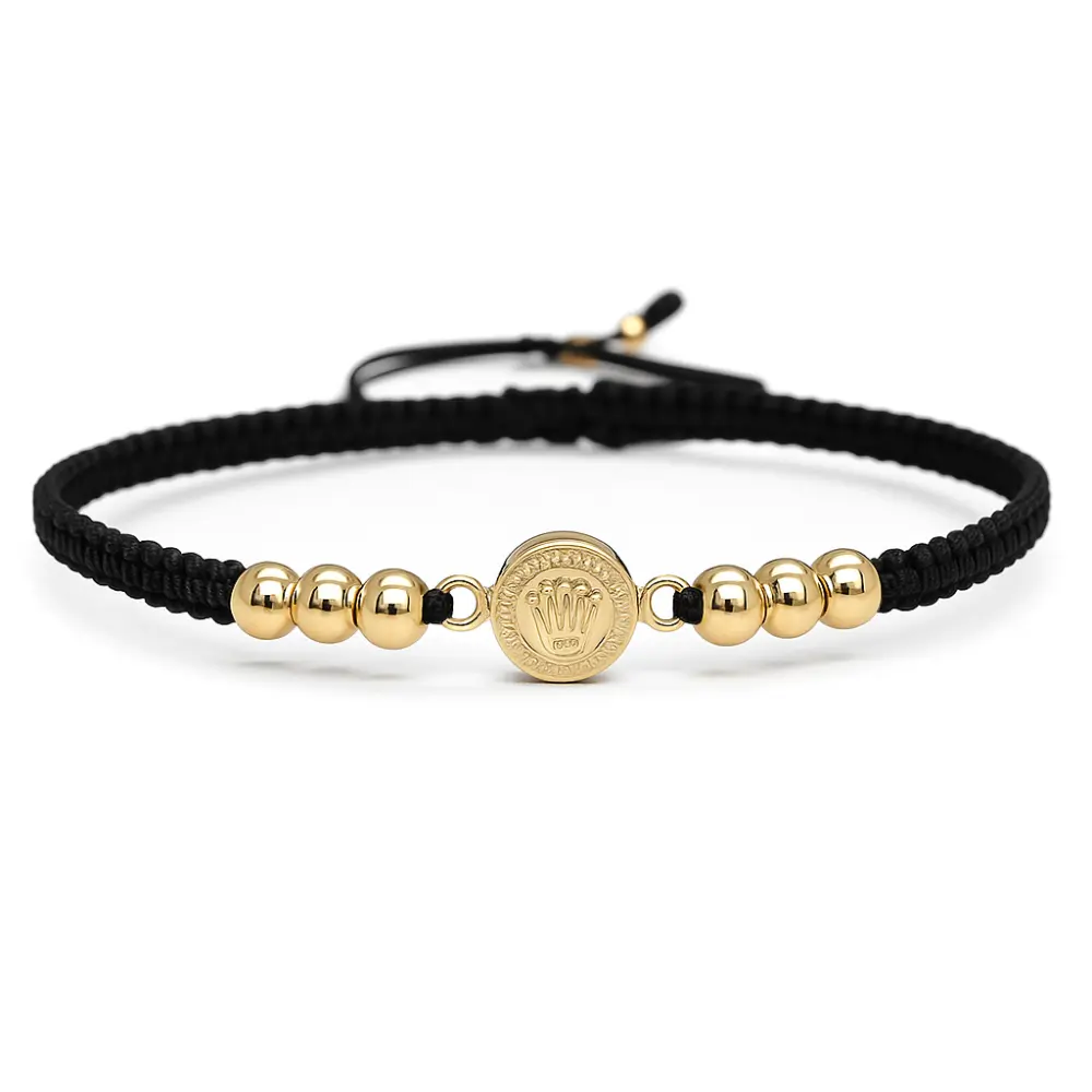 La manilla tejida herraje rolex combina lujo y sobriedad en un diseño inspirado en la elegancia atemporal de Rolex. Su tejido negro ajustable ofrece comodidad y resistencia, mientras los balines lisos de 4 mm y el medallón central en oro laminado 18k aportan un brillo refinado y duradero.
