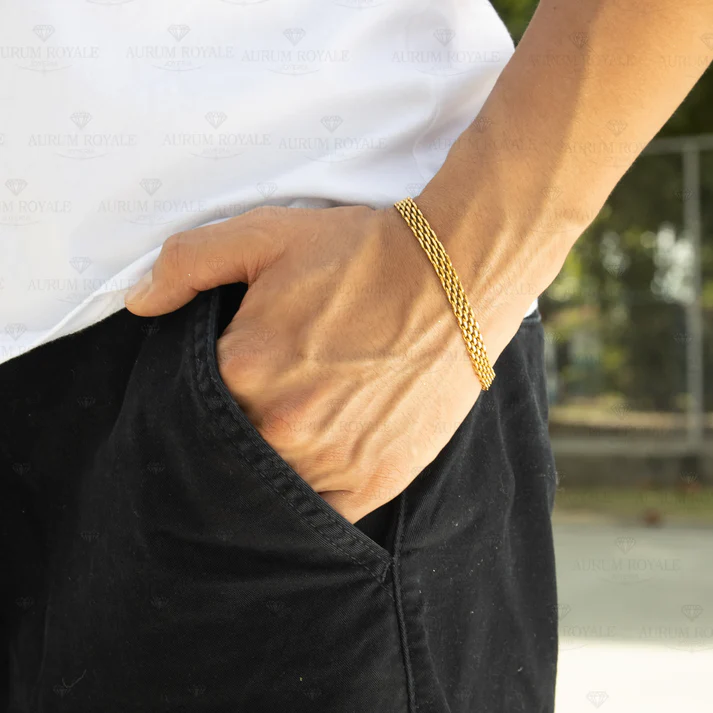 La Pulsera de tejido chino en oro laminado 18k es una joya masculina con estilo robusto y elegante. Disponible en anchos de 6 mm y 9 mm, su diseño resalta por la resistencia y el brillo característico del oro laminado certificado.