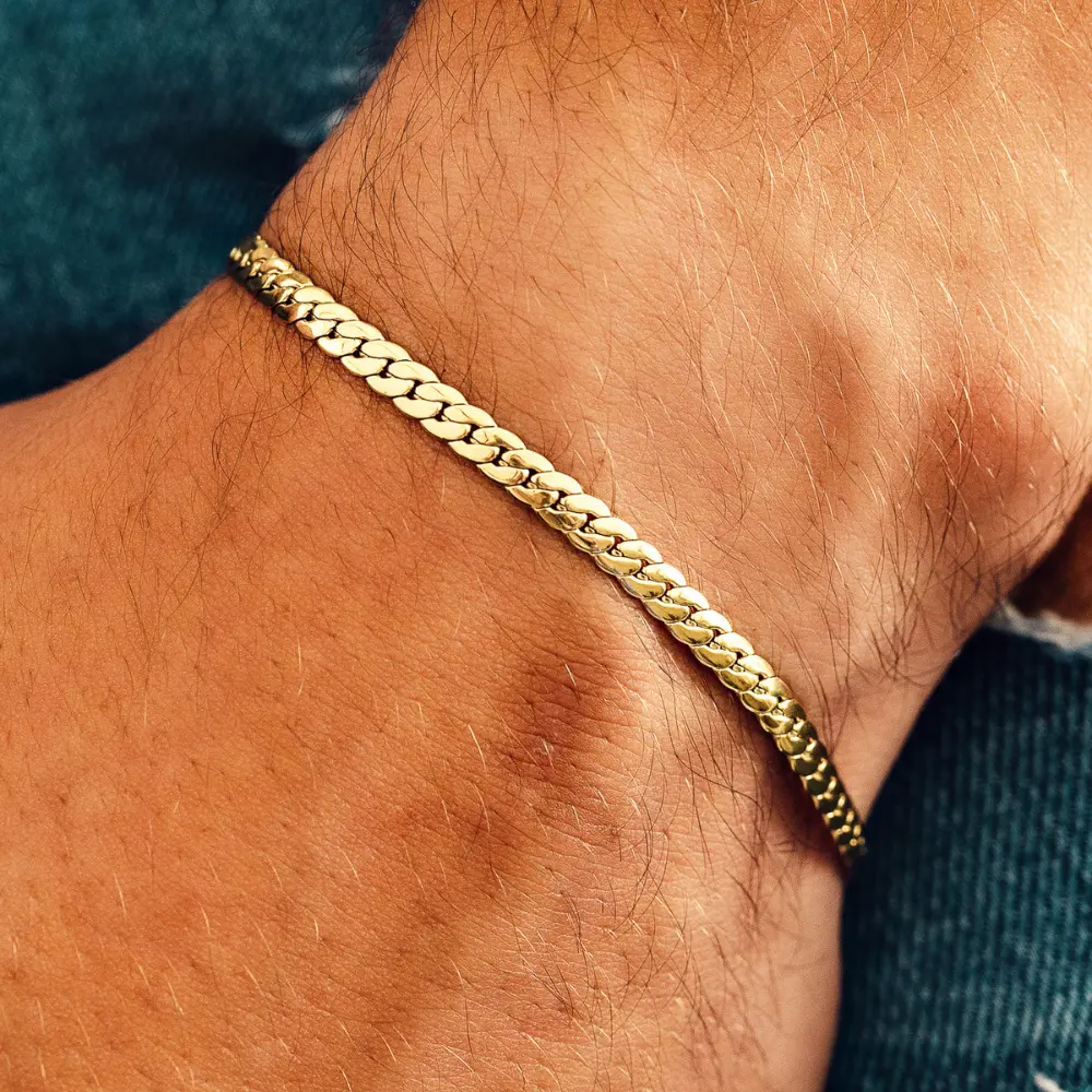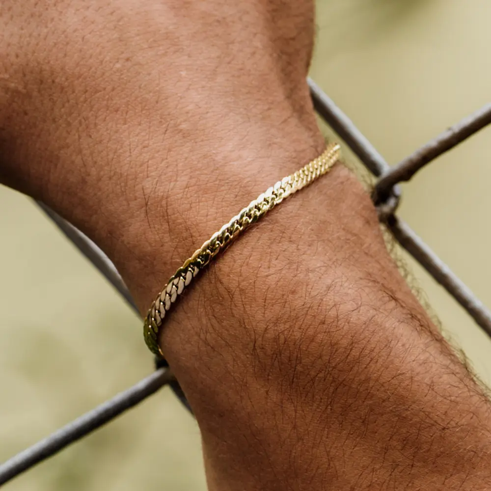 La Pulsera tejido serpiente oro laminado para hombre combina elegancia y fuerza en un diseño que evoca movimiento y estilo. Su forma ondulada recuerda la textura de una serpiente, aportando un toque distintivo y moderno al look masculino.